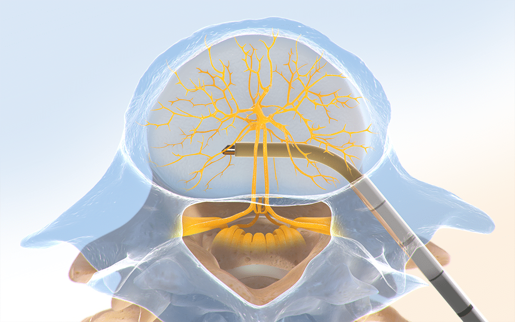 Vertebral endplates – found on either side of the disc – can become damaged over time, causing inflammation and back pain. The basivertebral nerve (BVN), found within the vertebrae, carries these back pain signals from the inflamed endplates to the brain.